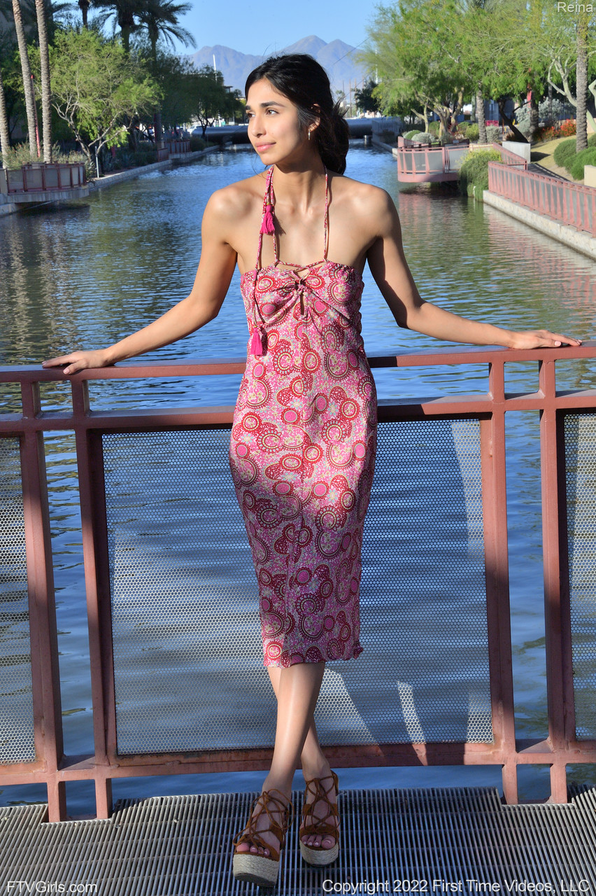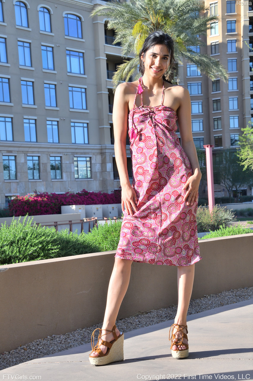 American ultra-cutie Reina poses in her long dress and takes off bare in public