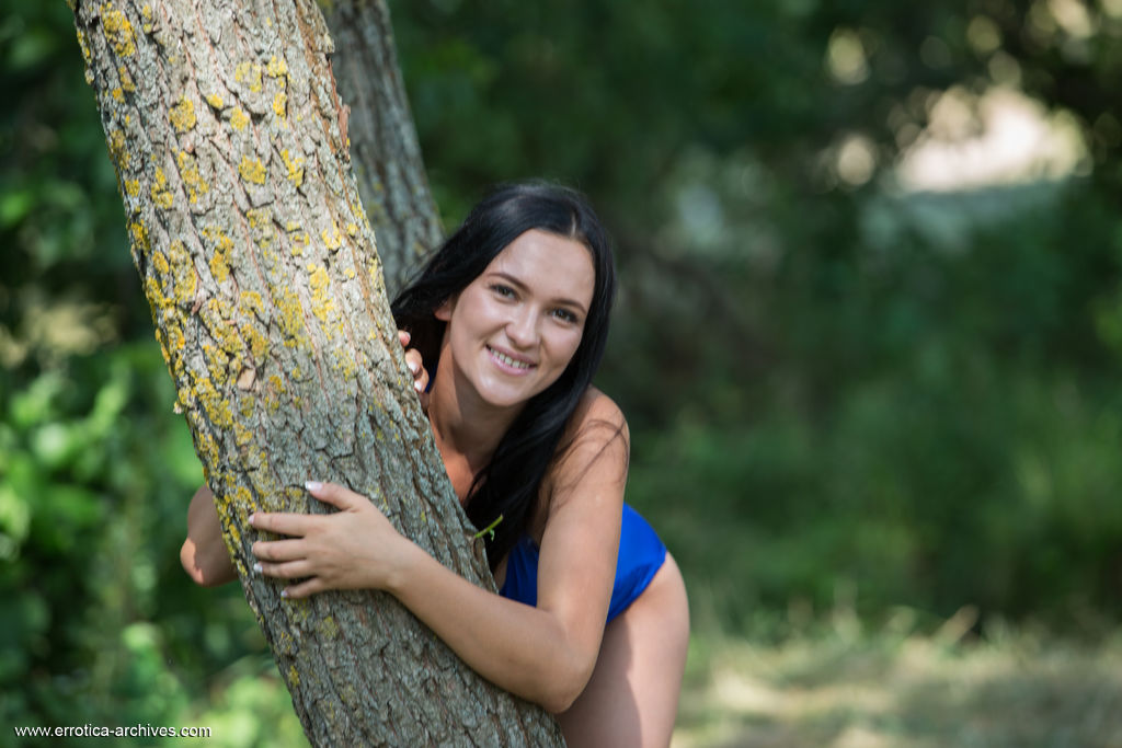 Dark-haired nubile Indiana Blanc liquidates a bikini to stance naked in a brook