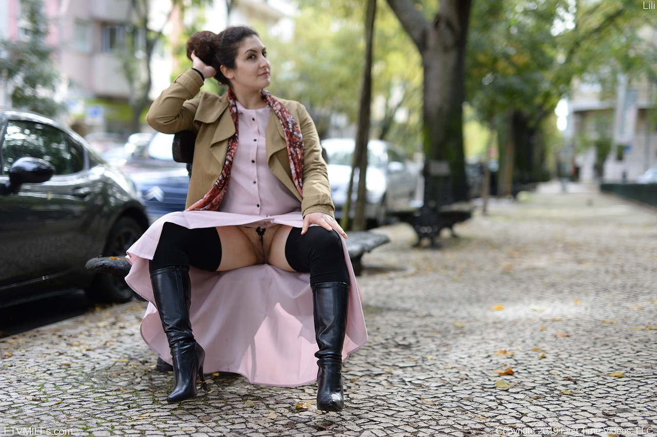Ebony-haired plumper showcases her upskirt beaver with a strand of pleasure buttons jammed in cootchie